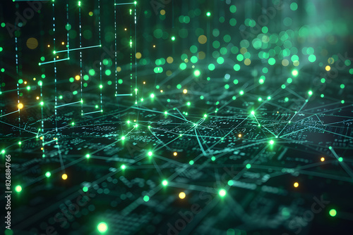 Abstract background displaying a futuristic digital grid pattern in shades of neon green and blue, with glowing lines and geometric shapes creating a high-tech and sci-fi aesthetic.
