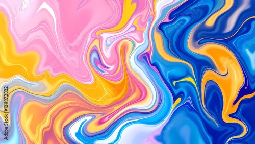 Abstract Background Featuring a Vibrant Blend of Pink, Blue, Yellow, and White Liquid Paint in a Dynamic Composition