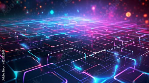 Abstract background, hi-tech blue and pink neon glow tranparent cube line and light particles, digital, cyberspace, cyberpunk, futuristic technology illustration. Generative AI