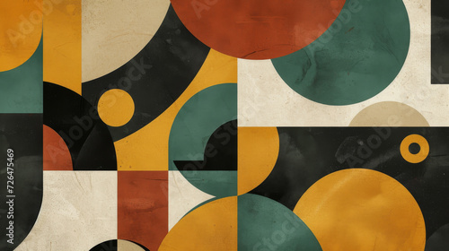 Abstract background in trendy Bauhaus style, combining espresso brown, sagebrush green and honey yellow with angular and rounded shapes