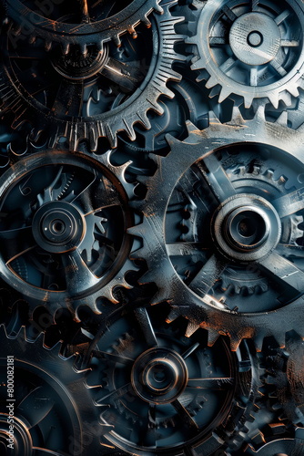 Abstract background metallic gears and cogs in various sizes, intertwined and casting shadows on a dark background.
