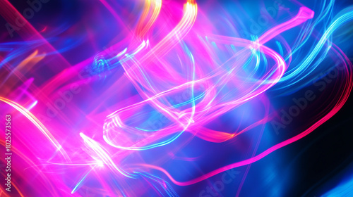 Abstract background. Neon blue and pink light, flashes. Futuristic empty neon background. High tech, cyber, energy concept. Glowing in ultraviolet spectrum, curvy neon lines. Laser show.