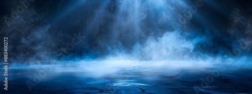 Abstract background of an empty stage, night scene with blue light rays and mist on the dark gray floor. Background for a product display presentation in the style of the studio. Dark background