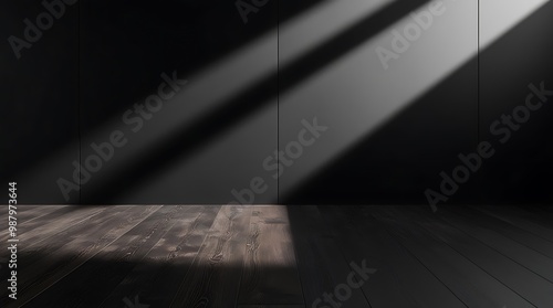 abstract background of dark empty room with wooden floorboards that have a rich, dark brown hue and sunlight shines on it