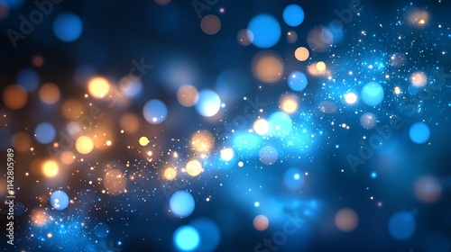 Abstract background of glowing lights and sparkles in blue and gold colors.