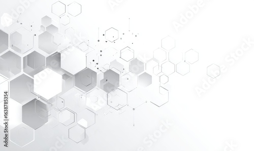 Abstract background of overlapping hexagons in varying shades of gray and white, with connecting lines and subtle dots