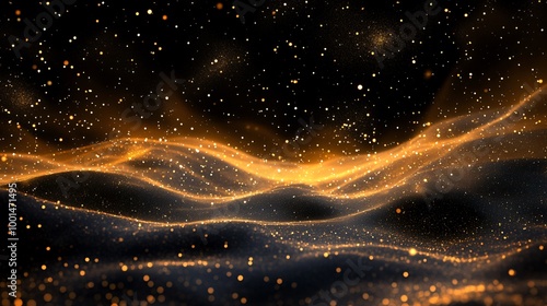 Abstract background of sparkling golden dust and bokeh lights on a black background.