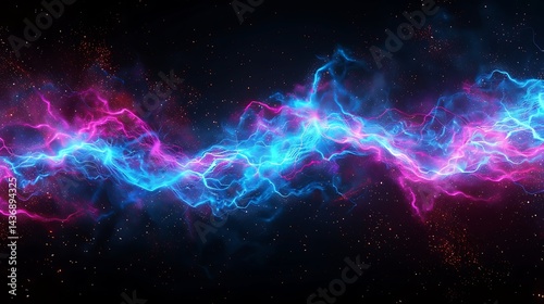 Abstract background of vibrant pink and blue energy waves resembling lightning or nebula clouds in dark space with stars. Cosmic power concept.