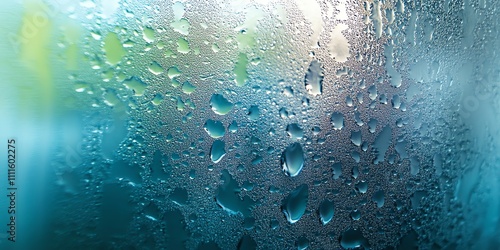 Abstract background of water drops on a glass surface with blurred blue and green background.