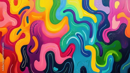 Abstract background painting featuring colorful squiggle lines and rainbow gradient design elements