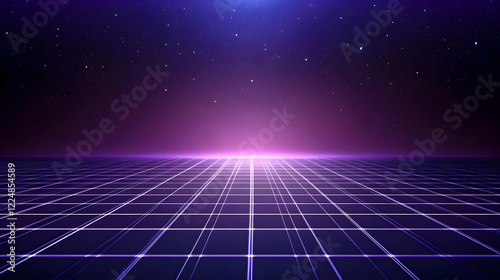 Abstract Background Shows Glowing Grid Landscape Under Purple Night Sky with Stars.