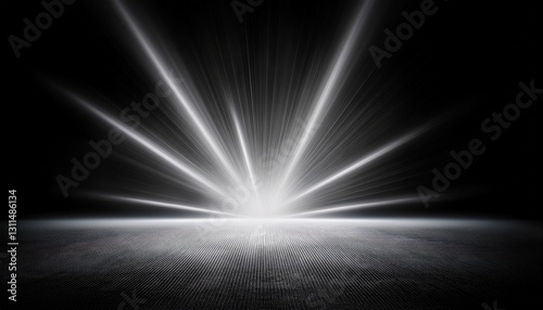 Abstract background. Smooth Black Light Beams Backdrop. Dynamic minimalist background. Soft white light beams stretch center outward on smooth black. Clean & modern.