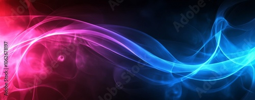 Abstract background with a blue and pink gradient, light rays, and wave lines.