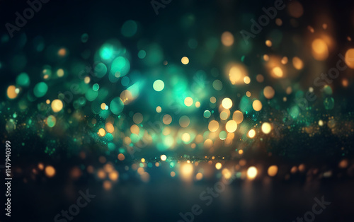 Abstract background with a dark, blurred, textured surface and out-of-focus lights creating a bokeh effect in shades of green, blue, and gold.