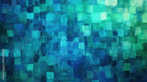 Abstract background with a pixelated effect, featuring small squares in varying shades of blue and green.