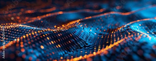Abstract background with blue and orange light rays, futuristic digital design elements, and glowing dots on dark backdrop