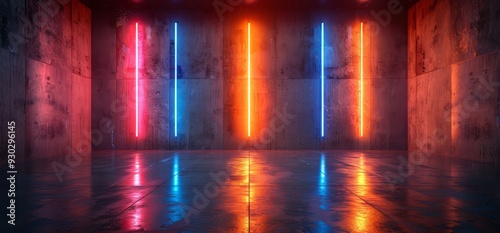 abstract background with blue and orange neon light stripes on a dark concrete wall in a modern empty room with a reflective floor.