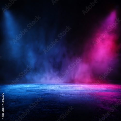 Abstract background with blue and pink neon lights smoke on dark floor for product display 3d render