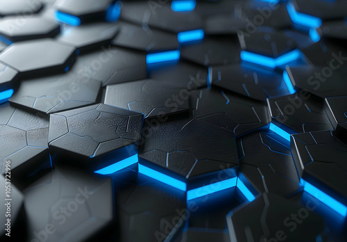 Abstract background with blue glowing hexagons on a dark gray wall, a futuristic design for a technology concept.