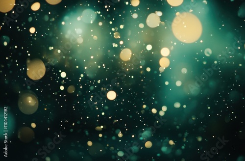 Abstract background with bokeh lights and glitter, teal and gold colors, glowing light effects, sparkling dust particles in the air, dark green backdrop, night sky.