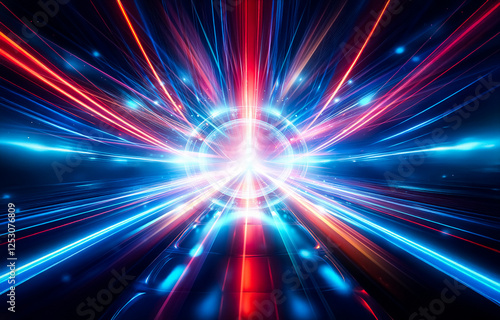 Abstract background with bright, colorful streaks of light radiating outwards from the center, creating an illusion of speed and movement.