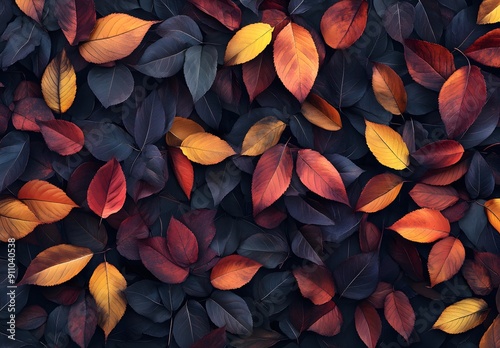 Abstract background with colorful autumn leaves, dark color palette, high resolution, professional photograph, cinematic lighting and colors