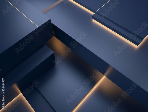 Abstract background with dark blue 3D geometric shapes and glowing golden lines, perfect for modern and tech designs.