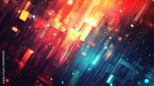 Abstract background with diagonal lines and glowing lights in red, orange, blue, and yellow colors.
