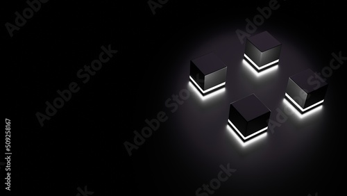 Abstract background with four cubes on a black floor. Copy space for text. 3D rendering.