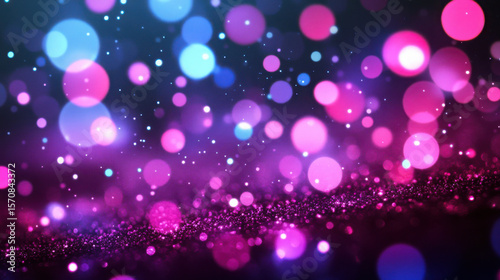 Abstract background with glowing bokeh light circles and glitter shimmer. Colorful particle effect for design. Festive holiday concept.