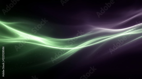 Abstract background with glowing green and purple light streaks and particles on a dark background. The image features soft, flowing lines and a