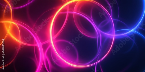 Abstract background with glowing neon circles in pink, orange, and blue colors on dark background.