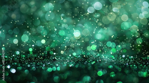 Abstract background with green bokeh and glitter, creating a festive and magical ambiance with a sparkling effect.