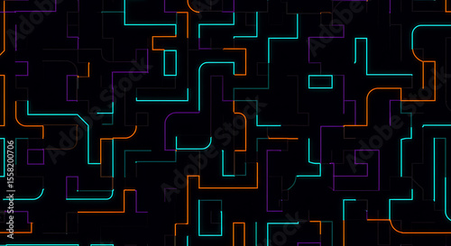 Abstract background with interconnected lines in teal, purple, and orange on a black backdrop.