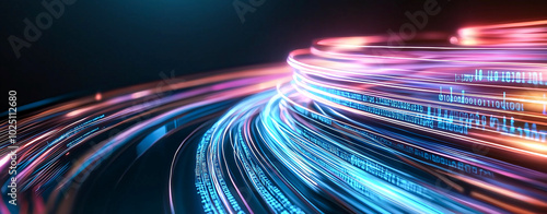 Abstract background with neon light rays and flowing digital lines, creating vibrant and dynamic atmosphere. interplay of colors evokes sense of energy and movement