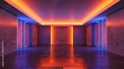 Abstract background with orange and blue neon lights reflecting on a tiled floor.