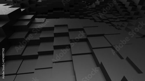 Abstract background with waves made of a lot of black cubes geometry primitive forms that goes up and down under black-white lighting. 3D illustration. 3D CG. High resolution.