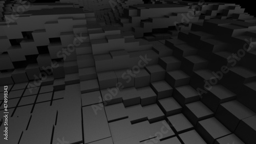 Abstract background with waves made of a lot of black cubes geometry primitive forms that goes up and down under black-white lighting. 3D illustration. 3D CG. High resolution.