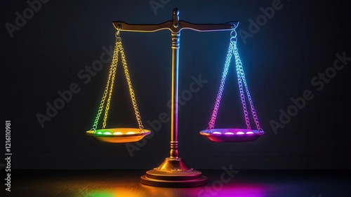 Abstract balance scales with colorful glowing weights, symbolizing harmony and measured progress