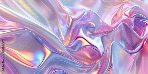 Abstract banner background with Metallic iridescent fabric featuring flowing waves in soft pastel shades of pink, blue, purple