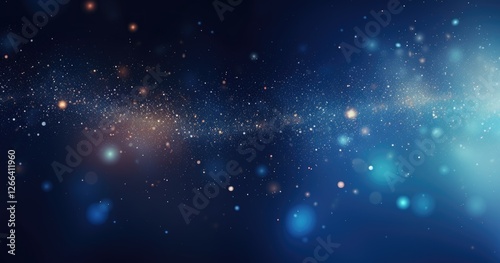 Abstract beautiful background with glowing particles and glitter on dark blue background, glittering dust or sparkles in the air