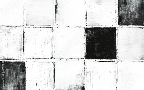 Abstract black and white checkerboard pattern with uneven textures and brush strokes on a blank canvas