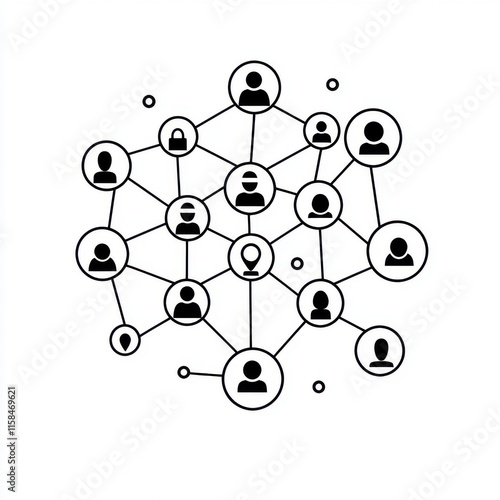 Abstract black and white illustration of a social network with interconnected profiles and nodes.