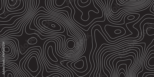 Abstract black background with white contour lines creating a topographic map pattern. Modern minimal design, seamless texture, wavy lines, elevation curves, and stylish geometric flow.