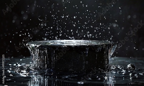 Abstract black stone pedestal, water splashing and dripping, dark moody background