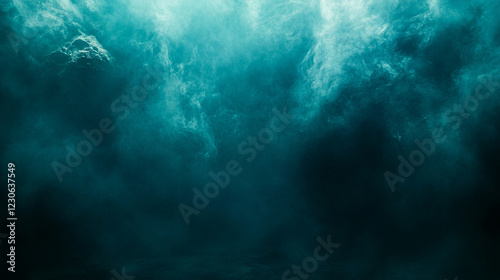 Abstract black turquoise blue blurred background with rough grunge grain texture, dark green glowing gradient, and noise effect, minimalistic bright light tone with empty caption space