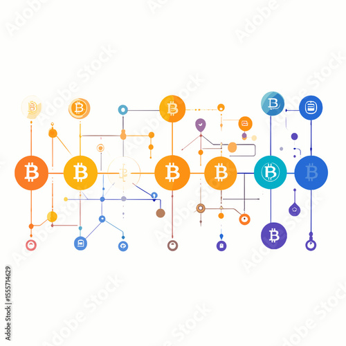 Abstract Blockchain Network Connecting Orange and Blue Bitcoin Symbols on White Background Representing Digital Cryptocurrency and Decentralized Financial Technology