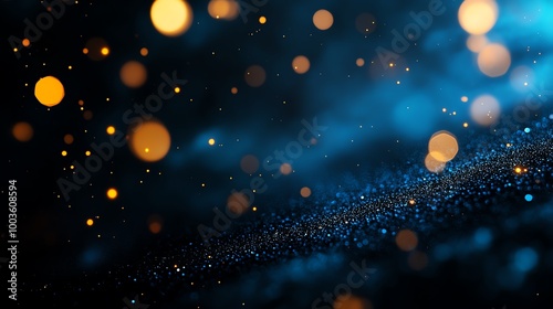 Abstract blue and gold bokeh lights on a dark background.