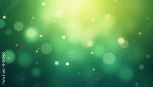 Abstract blue and green bokeh background with blurred bokeh circle, ethereal glow, golden particles, green foliage, dreamy atmosphere