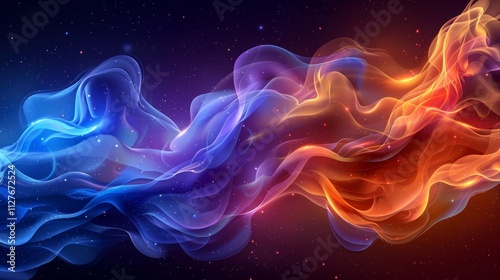 Abstract blue and orange energy waves flowing against a dark background with stars.
